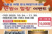 뉴스펀치 김길룡 기자 | 완도해양치유센터에서 10월 24일부터 26일까지 개최되는 ‘2025 청정 완도 가을 섬 여행’과 연계하여 ‘만원의 힐링’ 이벤트를 진행한다. ‘만원의 힐링’ 이벤트는 ‘완도왔섬, 치유됐섬’을 주제로 개최되는 ‘2025 청정 완도 가을 섬 여행’을 하는 관광객이 가을 섬 여행과 함께 부담 없이 해양치유 프로그램을 즐길 수 있도록 마련됐다. 이벤트는 ‘청정 완도 가을 섬 여행’의 프로그램인 ▲제2회 명사십리 치유길 맨발 걷기 페스티벌 ▲청산도 은하수 투어 ▲생일도 멍때리기 중 1개 프로그램에 참가(확인증 지참)하면 완도해양치유센터 프로그램(기본 2)을 1만 원에 체험할 수 있다. 참가자들은 10월 24일부터 11월 30일까지 완도해양치유센터 대표 그램인 딸라소풀과 해수 미스트 테라피, 해조류 거품 테라피, 머드 테라피를 이용할 수 있다. 한편 ‘청정 완도 가을 섬 여행’ 기간 동안 완도 해변공원 일원에서 ‘완도 해양치유’ 홍보관을 운영하여 관광객이 완도 여행을 추억할 수 있도록 ‘해양치유 힐링 한 컷’ 즉석 사진 인화 서비스를 제공할 예정이다. 군 관계자는 “힐링