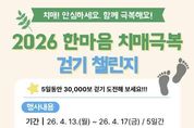 뉴스펀치 조평훈 기자 | 삼척시보건소 치매안심센터가 치매 예방에 좋은 ‘걷기’를 실천해 치매에 대한 인식을 개선하고 치매 극복을 기원하기 위해 오는 4월 13일부터 17일까지 5일간 '2026 한마음 치매극복 걷기 챌린지'를 운영한다. 이번 챌린지는 스마트폰을 소지한 삼척시민이라면 누구나 참여할 수 있다. 참여 희망자는 스마트폰에 모바일 걷기 애플리케이션인 ‘워크온’을 설치한 뒤, ‘뚜벅뚜벅, 삼척을 걷다’ 커뮤니티에 가입하여 ‘한마음 치매극복 걷기’ 챌린지 참여하기를 누르면 된다. 챌린지 목표는 5일 동안 총 3만 보를 걷는 것이며, 무리한 운동을 방지하기 위해 하루 걸음 수는 최대 6,000보로 제한된다. 기간 내에 목표를 달성한 참가자 중 선착순 300명에게는 소정의 인센티브를 지급할 예정이다. 목표 달성 후 앱 내의 ‘받기’ 버튼을 반드시 클릭해야 참여가 완료된다. 시 관계자는 “이번 걷기 챌린지를 통해 시민들이 치매에 대한 인식개선과 치매 예방의 중요성을 인식하고, 일상 속에서 건강한 생활 습관을 실천하는 계기가 되길 바란다”라며 지역 주민들의 적극적인 관심과 참여를 당부했다.