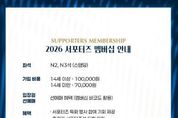뉴스펀치 박세훈 기자 | 김천상무 공식 서포터즈 ‘수사불패’가 멤버십 회원을 모집한다. 김천상무 공식 서포터즈 수사불패가 1월 28일부터 시즌 종료 시까지 ‘2026 서포터즈 멤버십’ 회원을 모집한다. 멤버십은 선착순 200명 한정으로 운영되며, 가입비는 14세 이상 10만 원, 14세 미만 7만 원이다. 이번 서포터즈 멤버십은 ‘역대급 혜택’으로 구성됐다. 먼저 멤버십 회원은 김천상무 홈경기 시 선수들과 가장 가까운 곳에서 응원의 열기를 느낄 수 있는 서포터즈석(N2, N3구역) 입장권을 정액 7천 원에 구매할 수 있다. 동시에 가입회원 본인에 한해 서포터즈석 선예매가 가능하다. 다양한 이벤트 혜택도 있다. 서포터즈 특화 행사 참여 기회가 제공되며, 홈경기 서포터즈석 티켓 지원, 원정경기 티켓 일부 지원 혜택도 받을 수 있다. 멤버십 패키지 구성 또한 풍성하다. 서포터즈를 형상화한 멤버십 실물카드와 랜야드가 기본으로 제공되며, 14세 이상 가입자는 구단 공식 의류 후원사 켈미 바람막이를 받을 수 있다. 14세 미만 가입자는