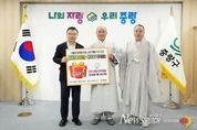 뉴스펀치 박상훈 기자 | 중랑구가 지난 6 일 오후 구청장실에서 사단법인 나누며하나되기와 함께 ‘ 취약계층 행복나눔 물품 전달식 ’ 을 진행했다 . 이번 전달식에서 대한불교천태종 산하 사단법인 나누며하나되기는 겨울철 추위와 경제적 어려움을 겪고 있는 지역 내 취약계층과 어린이들을 위해 5,000만 원 상당의 건강·생활·방역용품을 기탁했다. 기탁된 성품은 도움이 필요한 가정에 순차적으로 전달될 예정이다. 사단법인 나누며하나되기는 2003년 창립 이후 국내외에서 다양한 구호 활동을 이어오고 있으며, 중랑구와는 이번이 세 번째 나눔이다. 현재까지 중랑구에 전달한 성품의 누적 가액은 약 1억 원에 이른다. 류경기 중랑구청장은 “지역사회를 위해 꾸준히 따뜻한 나눔을 실천해 주셔서 감사드린다”라며 “기탁받은 성품은 도움이 필요한 이웃들에게 정성껏 전달해 모두가 온기를 느낄 수 있는 겨울이 되도록 하겠다”라고 말했다.