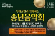 뉴스펀치 김길룡 기자 | 부여군은 (사)부여사랑합창단 주최로 오는 12월 13일 오후 3시, 국립부여박물관 사비마루 공연장에서 아름다운 음악으로 따뜻한 감동을 채울 '2025년 부여군민과 함께하는 송년 음악회'가 개최된다고 밝혔다. 이날 음악회는 (사)부여사랑합창단의 ‘새야새야’, ‘섬집아기’ 합창 공연 등과 함께 ▲유채훈(라포엠), ▲에클레시아(5인조 앙상블) 등 초대 가수를 초청하여 한해를 아름답게 마무리하는 화려하고 감동적인 공연이 펼쳐질 예정이다. 부여군 관계자는 “숨 가쁘게 지나갔던 지난 2025년을 되돌아보고 새해맞이를 준비하는 연말, 아름다운 음악 공연을 통해 일상의 힐링이 되길 바란다.”라고 말했다.