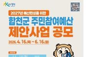 뉴스펀치 박세훈 기자 | 합천군은 2027년도 예산편성을 위한 주민참여예산 제안사업 공모를 6월 16일까지 실시하며, 올해부터 공모 분야를 기존 1개 모델 3개 유형에서 3개 모델 5개 유형으로 확대 개편한다고 밝혔다. 기존 공모사업이 시설 확충 등 ‘장소형 사업’에 편중되어 다양한 계층의 세밀한 요구를 반영하기 어려웠던 점을 개선하기 위해 공모 모델을 전면 재구조화하여, 올해는 총 20억 원 규모로, 기존 장소 중심의 사업에 당사자 맞춤형과 역점사업 주제형을 추가해 장소형, 당사자형, 주제형의 3개 모델로 운영된다. 이번 제안사업 공모는 △ 지역발전 및 생활 인프라 확충을 위한 ‘군정참여형’, ‘생활안전형’, ‘읍면주민주도형’의 '장소형' 3개 유형과, △ 세대 간 소통과 맞춤형 복지를 위한 '당사자형'의 ‘세대공감동행형’ △ 지역의 핵심 미래 전략을 반영한 '주제형'의 ‘관광·체육 특화형’ 총 5개 유형이며, 예산편성 기준에 맞지 않거나, 행사성사업, 특정 개인, 단체만을 지원하는 사업 등은 공모 대상에서 제외된다. 합천군민이면 누구나 공모에 참여 가능하고, 제안서를 작성해 읍·면사무소 또는 군청 기획예산