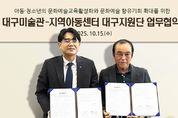 뉴스펀치 조평훈 기자 | 대구문화예술진흥원 대구미술관과 지역아동센터대구지원단(단장 이상열)은 지난 10월 15일 대구미술관에서 아동·청소년 문화예술교육 활성화와 문화예술 향유 기회 확대를 위한 업무협약을 체결했다. 이번 협약식에는 노중기 대구미술관장과 이상열 지역아동센터대구지원단장을 비롯해 양 기관 관계자들이 참석했으며, 지역 아동·청소년이 예술을 통해 성장할 수 있는 지속 가능한 협력체계 구축을 약속했다. 협약에 따라 양 기관은 ▲대구미술관 전시 및 교육 프로그램에 ‘지역아동센터’와 ‘대구형 방과 후 틈새돌봄사업’ 아동·청소년의 참여 지원 및 독려 ▲아동·청소년 대상 맞춤형 문화예술교육 프로그램 공동 기획 및 운영 ▲프로그램 참여 효과 제고를 위한 자료 공유 및 교육 정보 교류 ▲기타 상호 발전을 위한 교육 관련 협력 등 다양한 분야에서 상호 협력하기로 했다. 특히 이번 협약을 계기로 지역아동센터 종사자 교사를 대상으로 한 전문교육 워크숍을 오는 10월 21일 대구미술관에서 진행한다. 프로그램은 열린 교육 ‘샤이닝 트레일즈’와 연계하여 현대미술의 새로운 접근 방식을 모색하고, 자연·빛·인간을