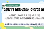 뉴스펀치 박세훈 기자 | 창원특례시 의창도서관과(과장 김외화)는 다양한 문화강좌를 통해 시민의 평생교육을 지원하고 문화생활의 기회를 제공하기 위해 ‘2026년 의창도서관과 상반기 문화강좌’ 수강생을 모집한다. 최윤덕도서관, 고향의봄도서관, 명곡도서관 3개 도서관에서 진행되는 이번 문화강좌는 ▲최윤덕도서관의 ‘독서 하브루타’를 포함한 성인 5개, 어린이 9개 강좌 ▲고향의봄도서관의 ‘팝과 함께하는 생활 영어’를 포함한 성인 3개, 어린이 5개 강좌 ▲명곡도서관의 ‘감성 어반 스케치’를 포함한 성인 2개, 어린이 6개 강좌를 운영한다. 상반기 수강생 모집은 3월 3일 오전 10시부터 최윤덕·고향의봄·명곡도서관 누리집에서 선착순 접수 예정이다. 의창도서관과 김외화 과장은 “도서관이 단순한 독서 공간을 넘어, 다양한 문화강좌로 시민들이 풍요로운 문화생활을 누릴 수 있는 독서문화 환경을 제공하겠다”며 시민들의 많은 관심과 참여를 당부했다. 자세한 내용은 최윤덕도서관, 명곡도서관, 고향의봄도서관 누리집과 의창도서관과 블로그를 참고하면 된다.