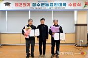 뉴스펀치 정홍균 기자 | 장수군은 2일 장수군농업기술센터에서 최훈식 장수군수와 최한주 군의회 의장, 수료생 80여 명이 참석한 가운데 ‘제23기 장수군 농업인대학 수료식’을 개최했다고 밝혔다. 올해 장수군 농업인대학은 지난 3월에 개강해 11월까지 농업인의 전문능력 향상을 위해 사과·두릅·지속가능한 치유농업 등 총 3개 과정을 편성해 교육생 132명을 대상으로 진행했다. 교육은 이론 수업과 현장 실습을 병행한 총 37회, 175시간의 체계적인 프로그램으로 구성됐으며, 이를 통해 장수농업을 선도할 수 있는 87명의 수료생을 배출했다. 수료식에서는 올해 교육 운영 과정에서 자치활동에 공로가 큰 백승덕 교육생에게 공로상이 수여됐으며, 김연수·김형중 교육생이 전 과정을 우수한 성적으로 이수해 우수상을 받았다. 다양한 지역 농업인들이 함께 참여한 본 과정은 단순한 기술 습득을 넘어 농업경영 역량을 강화하는 데 실질적 도움이 된 것으로 평가되고 있다 수료생들은 “농업인대학에서 배운 지식과 경험을 현업에 적용해 고품질 농산물 재배와 효율적인 경영관리로 소득을 높이는데 도움이 되는 유익한 시간이었다”