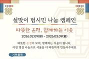 뉴스펀치 박상훈 기자 | 서울시는 3월 9일까지 서울잇다푸드뱅크센터와 함께 '2026년 설맞이 범시민 나눔 캠페인'을 추진한다. 이번 캠페인은 개인, 기업, 기관의 자발적인 식품 및 생활용품 기부로 진행되며, 시는 이를 통해 취약계층이 소외되지 않는 따뜻한 겨울을 보내고 지역사회 전반에 나눔문화가 확산되길 기대하고 있다. 기부 가능한 품목은 통조림, 캔음료, 라면, 쌀 등 장기간 보관이 가능한 식품과 생활용품(의류, 휴지, 치약 등)이며, 소비기한이 임박한 식품은 기부가 제한된다. 신선·냉장·냉동식품의 경우 자치구 잇다푸드뱅크 문의를 통해 기부 가능 여부를 사전 확인해야 한다. 해당 캠페인은 매년 설과 추석 명절에 추진되는 범시민 참여형 나눔 행사로, 지난해에는 총 16억 4천만 원 상당의 기부금과 현물의 온정이 모였으며, 서울시 취약계층 25,078가구에 전달됐다. 캠페인 참여를 원하는 경우 구청, 동주민센터, 아파트, 교회 등 자치구별 거점기관에 설치된 기부박스에 식품과 생활용품 등의 현물을 기부할 수 있으며, 기부박스 설치 위치 등 세부 참여 장소는 서울잇다푸드뱅크 누리집 ‘참여하기-캠페인후원’에서 확인할