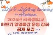 뉴스펀치 김보성 기자 | 원주시 평생교육원 학습관은 9월 22일부터 28일까지 2025년 라라밸학교 하반기 일일특강 운영 강좌(강사)를 모집한다. 라라밸학교(Life · Lifelong-learning Balance)는 시민들의 삶과 평생학습의 조화를 위해 다양한 일일특강 등 단기프로그램을 개설·운영하는 사업이다. 요리·공예·미술·운동 등 일일특강이 가능한 분야를 대상으로 강좌를 공개모집하고 있다. 강좌 신청은 9월 22일부터 28일까지 전자우편으로 접수한다. 제출 서류 등 세부 내용은 학습관 홈페이지에 게시된 공고문에서 확인할 수 있다. 이번 모집에 선정된 10개 강좌는 11월 1일 학습관에서 일일특강으로 진행될 예정이다. 윤석재 학습관장은 “시민들이 다양한 평생학습 프로그램을 접하고 배움의 기쁨을 느끼는 행복한 일상을 보낼 수 있도록 더욱 힘쓰겠다”라고 말했다.