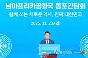 뉴스펀치 김용희 기자 | 주요 20개국(G20) 정상회의 참석을 위해 남아프리카공화국을 방문한 이재명 대통령은 23일(현지시간) 양국 수교 후 최초로 동포간담회를 개최해 현지에 거주하는 동포들을 격려했다. 이번 간담회에는 동포단체 대표, 경제인, 민주평통 자문위원, 한글학교 관계자, 문화예술인 등 약 70명이 참석했다. 동포 대표로 나선 전소영 남아공 한인회장은 환영사에서 "한국과 남아공은 오랜 세월 우정과 신뢰를 쌓아온 파트너인 만큼, 대통령님의 이번 방문이 양국 관계를 굳건히 다지는 계기가 되기를 기대한다"는 소망을 전했다. 이 대통령은 격려사를 통해 "모국에서 약 1만 2000km인 삼만 리나 떨어진 남아공에서도 동포들이 주권 행사에 어려움이 없도록 전자투표 도입 등 재외선거제도 개선에 노력하겠다"라고 말했다. 또한, "재외동포 현황을 면밀히 파악하고 동포들의 활동을 본국이 적극 지원해 대한민국 국민으로서 소외되지 않고 자부심을 가질 수 있도록 최선을 다하겠다"고 격려했다. 이어 이동민 민주평통자문회의 아프리카협의회 중남부지회장의 건배사로 본격적인 오찬이 시작됐다. 이 대통령