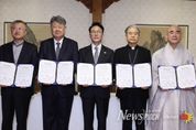 뉴스펀치 김용희 기자 | 김민석 국무총리는 11월 24일 오전 한국교회총연합 대표회장 김종혁 목사, 한국천주교주교회의 의장 이용훈 주교, 원불교 교정원장 나상호 교무, 대한불교조계종 총무부장 성웅스님과 만나, 정부와 종교계 간 “상생협력 원탁회의 구성을 위한 협약” 및 “생명존중 및 자살예방을 위한 협약”을 체결했다, 이번 협약은 사회적 난제를 다루는데 정책적 접근만으로는 한계가 있으며, 국민의 마음과 삶까지 살피기 위해 국민 곁에서 마음을 보듬어온 종교계의 지혜가 필요하다는 인식 아래 마련됐다. 특히, 국민의 생명과 안전을 지키기 위해 자살률을 낮추는 데 정부와 종교계의 협력이 필요하다는 공감대를 바탕으로, 생명존중 및 자살예방을 위한 효과적인 협력사업을 추진하기 위해 체결됐다. 이날 협약에 따라 정부와 종교계는 우리나라의 주요한 사회 문제에 대해 함께 논의하고 합리적인 해결책을 모색하기 위해 협력하기로 했으며, 지속가능성을 확보하기 위해 현안별로 국무총리가 주재하는 원탁회의를 정례적으로 운영하기로 했다. 첫 번째 주제로 생명존중 및 자살예방 분야 협력방안을 논의했으며, 정부와 종교계는 ▴생명존