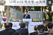 뉴스펀치 김길룡 기자 | 진주시는 27일 경상국립대학교 칠암캠퍼스의 ‘6·25참전 학도병 명비’ 앞에서 ‘제3회 6·25참전 학도병 추모제’를 거행했다. 이번 추모제는 6·25전쟁 당시 어린 나이에 전쟁터에서 산화한 학도병들의 넋을 위로하고 그들의 숭고한 희생정신을 기리기 위해 마련됐다. 진주에서는 6·25전쟁 당시 진주농림고등학교(現 경상국립대), 진주고등학교, 진주사범학교(現 진주교육대)의 학생 152명이 학도병으로 참전했으며, 당시 참전 학도병 중에 현재까지 생존자는 10여 명으로, 생존자들의 연령이 90세가 넘은 상태이다. 이날 행사는 차석호 진주시 부시장과 보훈 단체장, 유가족, 학생 등 100여 명이 참석한 가운데 묵념과 헌화, 분향, 추모사, 추모헌시 낭독 등의 순으로 진행됐다. 차석호 진주시 부시장은 “펜 대신 총을 들고 군번과 계급도 없이 부모 형제와 교정을 떠나 전쟁터로 향했던 그들의 숭고한 희생과 애국정신을 가슴 깊이 새기겠다”면서 “앞으로 학도병과 유가족이 자긍심을 갖고 살아갈 수 있도록 예우에 최선을 다하겠다”고 말했다.