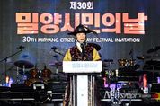 뉴스펀치 김길룡 기자 | 경남 밀양시는 삼문동 야외공연장 일원에서 시민과 방문객 등 10,000여 명이 참석한 가운데 제30회 밀양 시민의 날 기념식 및 시민 한마당 축제를 성황리에 마무리했다고 18일 밝혔다. 이번 행사는 국제와이즈멘 밀양클럽이 주관해 읍·면·동 거리 퍼레이드를 시작으로 기념식, 시민 한마당 축제, 열린음악회, 불꽃놀이까지 다채로운 프로그램이 이어지며 시민의 자긍심과 화합을 다지는 축제의 장이 됐다. 기념식은 미래 세대의 주역인 밀양 청소년을 대표해 밀성고등학교 박해수·황윤준 학생의 시민헌장 낭독으로 시작됐으며, 제27회 밀양 시민대상은 문화 부문 김은민 극단메들리 대표, 산업 부문 조문수 한국카본 대표이사, 봉사 부문 손흥상 해심장학재단 이사장이 수상의 영예를 안았다. 또한 시군 통합 및 지방자치 30주년 기념 퍼포먼스를 통해 지난 30년간 밀양의 발전 여정을 되돌아보고, 눈부신 성장과 변화를 시민 모두가 함께 축하하는 뜻깊은 시간을 가졌다. 이후 열린 시민 한마당 축제에서는 국내 최고 수준의 밀양아리랑오케스트라의 연주와 가수 이기찬, 소프라노 심규연의 무대가 이어져 감동과 열기