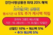 뉴스펀치 김길룡 기자 | 춘천시가 ‘코리아 그랜드 페스티벌’을 맞아 오는 29일부터 내달 9일까지 춘천사랑상품권 결제 시 5% 캐시백을 제공한다. 제공은 행사 기간 중 모바일 춘천사랑상품권으로 결제하면 5%가 자동 적립되는 방식으로 이뤄진다. 시는 이번 캐시백 행사를 위해 국비 1억 5,800만 원을 확보했으며 지역 내 1만 4,000여 가맹점에서 사용이 가능하다. 예산이 소진될 경우 조기 종료된다. 이번 행사는 정부 주도 코리아 그랜드 페스티벌에 발맞춰 춘천시가 준비한 지역형 소비 활력 프로젝트다. 앞서 춘천시는 지난 9월부터 12월까지 춘천사랑상품권 할인율을 13%로 상향하고 발행 규모도 월 100억 원으로 확대해 연말연시 시민들의 생활비 부담을 줄이고 지역내 소비 촉진에 힘쓰고 있다. 경창현 경제정책과장은 “이번 캐시백이 지역 소비를 촉진하고 소상공인에게 실질적인 도움이 되길 기대한다”며 “앞으로도 지역경제 활성화를 위한 다양한 정책을 적극 발굴·추진해 나가겠다”고 밝혔다.