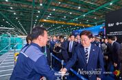 뉴스펀치 김용희 기자 | 이재명 대통령은 25일 오후 한국항공우주산업(KAI)에서 열린 KF-21 양산 1호기 출고식에 이어 고정익 생산 현장을 시찰했다. 고정익 생산 현장인 고정익동은 축구장 3개 크기에 해당하는 2만1천㎡ 규모의 공간을 갖췄으며, KF-21을 비롯해 FA-50, T-50 등을 생산하고 있다. 김종출 한국항공우주산업 대표이사는 "연간 50대 이상 생산 가능한 제조 능력을 구축하고 있다"며 "수출 물량 증가에 대비해 지속적으로 투자를 이어갈 계획"이라고 밝혔다. 한국항공우주산업은 올해 KF-21 8대와 FA-50 19대 등 총 27대를 납품할 예정이며, 내년과 내후년에는 각각 31대와 47대를 납품할 계획이다. 고정익동에는 수출 물량이 공정에 따라 일렬로 배치돼 있었다. 이재명 대통령은 말레이시아(FA-50 13대), 폴란드(FA-50 14대), 인도네시아(T-50 4대) 등과 체결한 수출 계약 물량을 정상적으로 조립하고 있는 상황을 확인했다. 이어 이재명 대통령은 한국형 전투기의 핵심인 최첨단 에이사(AESA) 레이다를 포함한 각종 항공전자장비의 높은 독자 개발 수준에 대해 설명을