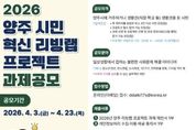 뉴스펀치 박상훈 기자 | 양주시가 시민이 일상에서 겪는 사회문제를 직접 발굴하고 해결 방안을 모색하는 ‘2026년 양주 시민 혁신 리빙랩 프로젝트’ 공모를 오는 23일까지 진행한다. 이번 공모는 시민 참여를 기반으로 지역사회 문제 해결 방안을 도출하기 위해 마련됐다. 양주시에 거주하거나 직장·학교 등 생활권을 둔 시민이면 누구나 참여할 수 있다. 참여는 주제안자를 포함한 4인 이상으로 구성된 팀 단위로 가능하며, 공감토크(현장심사)와 과제 선정 이후 진행되는 워크숍, 성과공유회(12월 예정) 등에 참여해야 한다. 공모 주제는 청소년·청년, 탄소중립, 도시재생, 1인 가구, 반려동물 문화, 디지털 격차 등 지역사회가 직면한 다양한 사회문제 해결과 관련된 아이디어다. 접수된 제안은 사회적 가치와 효과성·창의성, 실현 가능성 등을 기준으로 제안심사실무위원회 심사와 공감토크 현장심사를 거쳐 최종 과제로 선정된다. 최종 선정된 2개 팀은 5월부터 11월까지 약 7개월간 퍼실리테이터(활동촉진자)와 함께 워크숍에 참여하며, 문제 정의부터 개선 방향 도출, 시범사업 추진까지 단계별 프로젝트를 수행하게
