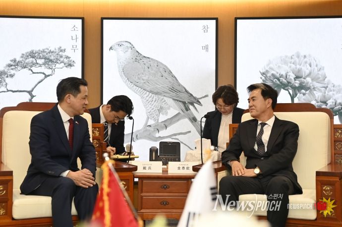 뉴스펀치 강영선 기자 | 김태흠 충남도지사는 6일 도청 접견실에서 다이빙(戴兵) 주한 중국대사와 만나 양 지역 간 교류·협력 확대 방안을 논의했다.