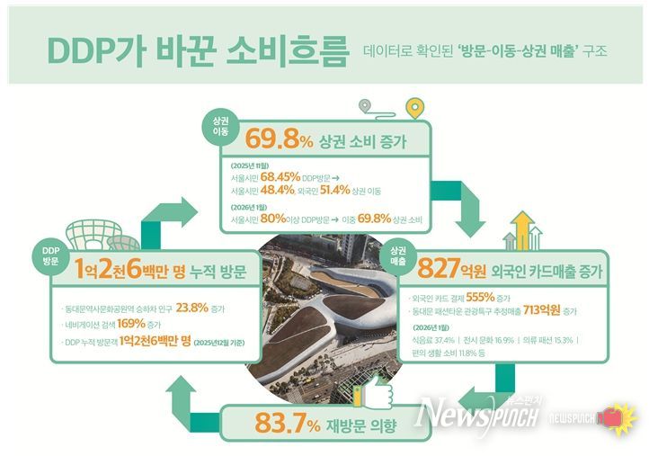 실제로 DDP가 위치한 동대문역사문화공원역(2‧5호선) 승하차 인원이 몇 년새 뚜렷하게 증가했으며, 네비게이션 목적지 검색건수도 늘었다. 또한 DDP 방문객 10명 중 7명(69.8%)은 주변 상권을 이용했다고 답해 DDP가 지역 상권 소비 매개로 자리잡았다는 것이 데이터로 확인되고 있다. 특히 외국인들이 만족하는 서울 대표 명소로 꼽히며 외국인의 인근 상권 지출이 2년새 6.5배나 증가했다.