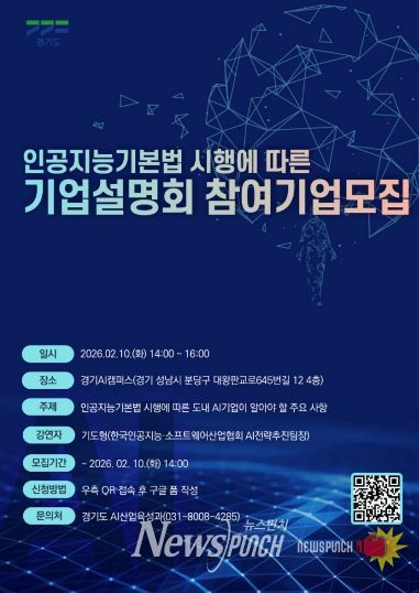 뉴스펀치 박상훈 기자 | 경기도가 지난 1월 22일 시행된 ‘인공지능 기본법’에 대한 도내 기업들의 이해를 돕기 위해 10일 오후 2시 판교 경기AI캠퍼스에서 AI 기업 대상 설명회를 개최한다.