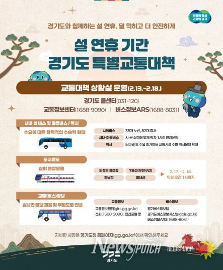 뉴스펀치 박상훈 기자 | 경기도가 안전하고 편한 설 귀성길 조성을 위해 13일부터 18일까지 6일간을 ‘2026년도 설 연휴 특별교통대책기간’으로 정하고 시외버스 증차, 도로정보 실시간 안내, 긴급도로 복구 체계 구축 등 적극 대응한다.