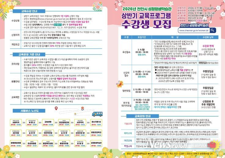 뉴스펀치 강영선 기자 | 천안시 성정평생학습관이 시민의 삶의 질 향상을 위해 ‘2026년 상반기 교육 프로그램’ 수강생을 모집한다고 9일 밝혔다.