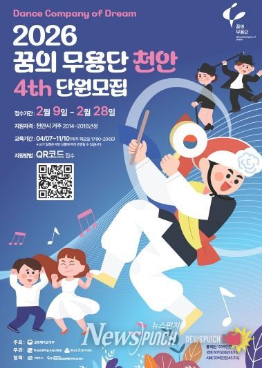 뉴스펀치 이현승 기자 | 천안문화재단이 지역 아동의 예술적 감수성과 협업 역량을 키우는 ‘2026 꿈의 무용단 천안’ 단원을 9일부터 28일까지 모집한다.