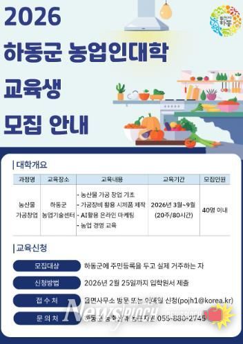 뉴스펀치 박세훈 기자 | 하동군은 농산물 가공 및 창업을 희망하는 군민을 대상으로 전문 인력을 육성하기 위해 ‘2026년 하동군농업인대학’ 교육생을 오는 2월 25일까지 모집한다고 밝혔다.