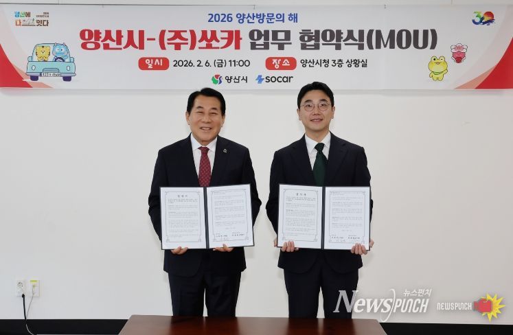 뉴스펀치 박세훈 기자 | 양산시는 지난 6일 양산시청 상황실에서 모빌리티 플랫폼 (주)쏘카와 '2026 양산방문의 해' 성공적 추진과 지역 관광 활성화를 위한 업무협약(MOU)을 체결했다고 밝혔다.