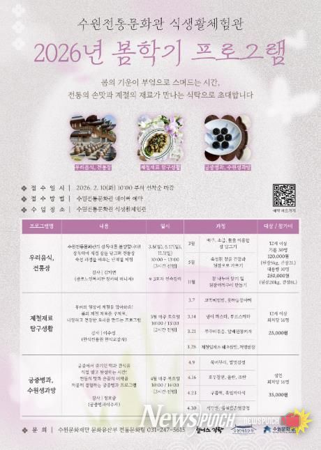 뉴스펀치 박상훈 기자 | 수원문화재단은 오는 10일부터 수원전통문화관 식생활체험관 2026년 봄학기 프로그램 참여자를 모집한다. 이번 봄학기 프로그램은 계절의 변화에 맞춘 전통 식문화와 다양한 음식을 시민들이 쉽고 재미있게 경험할 수 있도록 기획했다. 전통장 담그기부터 제철 식재료 요리, 궁중병과 체험까지 다양한 내용으로 운영한다.