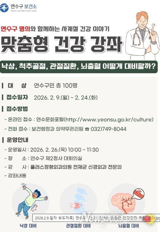 강좌는 연수구민 100명을 대상으로 진행되며, 고령층을 비롯해 건강관리에 관심 있는 주민 누구나 참여할 수 있다. 참여자 모집은 9일부터 연수문화포털 및 전화 접수를 통해 진행된다.