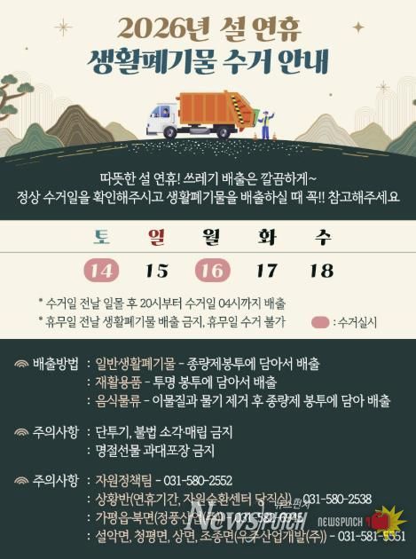 뉴스펀치 박상훈 기자 | 가평군은 설 명절을 맞아 군민과 방문객 모두가 쾌적한 환경에서 청결한 연휴를 보낼 수 있도록 생활폐기물 처리 대책을 마련했다.