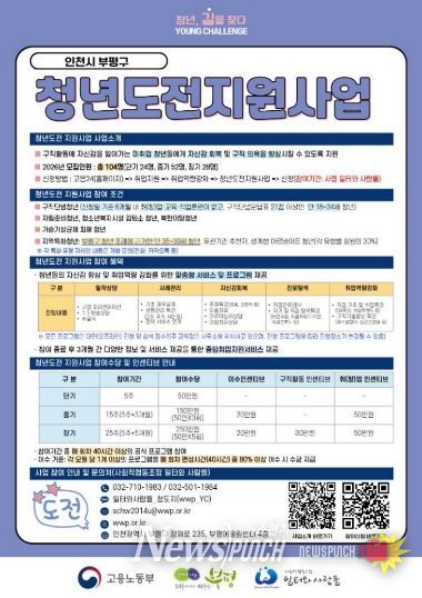 뉴스펀치 정홍균 기자 | 부평구는 오는 10월까지 구직에 어려움을 겪고 있는 지역 청년들의 사회 재진입을 돕기 위한 ‘2026년 청년도전지원사업’ 참여자를 모집한다고 밝혔다.
