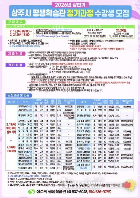뉴스펀치 박세훈 기자 | 상주시 평생학습원은 시민들의 자기 계발과 평생교육 기회 확대를 위하여 2026년 상반기 평생학습관 정기과정 수강생을 모집한다.