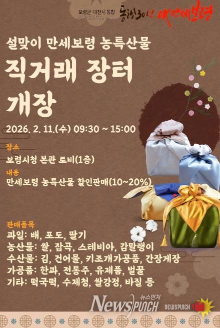 뉴스펀치 이현승 기자 | 보령시는 설을 맞아 오는 11일 오전 9시 30분부터 오후 3시까지 보령시청 본관 1층 로비에서 ‘2026년 설맞이 만세보령 농특산물 직거래장터’를 운영한다고 밝혔다.