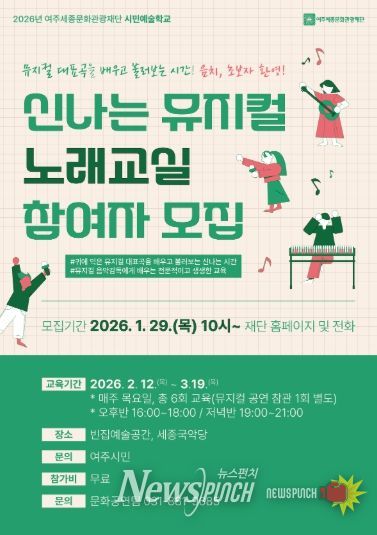 뉴스펀치 박상훈 기자 | 여주세종문화관광재단은 오는 12일부터 시민예술학교 프로그램의 일환으로 ‘신나는 뮤지컬 노래교실’을 운영한다.