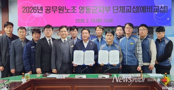뉴스펀치 이현승 기자 | 충북 영동군과 전국공무원노동조합 영동군지부는 지난 10일 군청 상황실에서 노사 양측 대표교섭위원인 정영철 영동군수와 신상훈 노조 지부장 등 교섭위원 13명이 참석한 가운데 ‘2026년도 공무원노조 단체교섭 상견례’를 가졌다.
