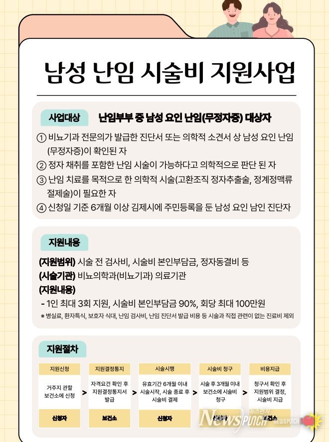 뉴스펀치 최영남 기자 | 김제시 보건소는 난임의 원인이 남성 요인인 경우에도 적절한 치료를 받을 수 있도록 2026년‘남성 난임 시술비 지원사업’을 신규 추진한다고 밝혔다.