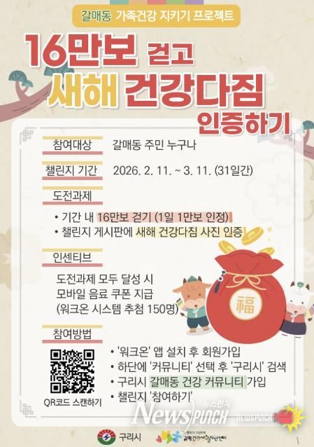 뉴스펀치 박상훈 기자 | 구리시 갈매건강생활지원센터는 새해를 맞아 오는 2월 11일부터 31일간, 갈매동 주민의 건강한 생활 습관 실천을 돕기 위한 ‘16만 보 걷고 새해 건강 다짐 인증하기’ 갈매동 이웃 공유 챌린지를 운영한다고 밝혔다.