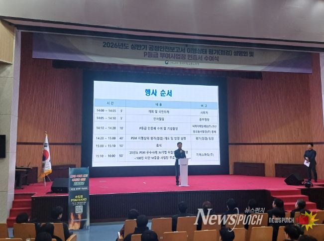뉴스펀치 정홍균 기자 | 중부지방노동청 수도권 중대산업사고 예방센터는 2월 11일 오후 2시부터 안산시 단원구 소재 중소벤처기업연수원 대강당에서 '2026년 상반기 공정안전관리(PSM) 이행상태 평가(점검) 사업 설명회'를 개최했다.