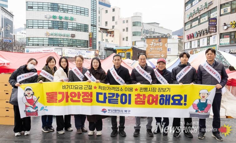 뉴스펀치 김윤걸 기자 | 부산 북구는 10일 설 명절을 앞두고 구포시장에서 장바구니 물가 부담을 줄이기 위한 물가안정 캠페인을 진행했다.