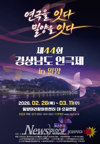 뉴스펀치 박세훈 기자 | 밀양시는 경남 연극인들의 최대 축제이자 경연대회인 ‘제44회 경상남도 연극제’가 오는 2월 26일부터 3월 11일까지 14일간 밀양아리랑아트센터에서 개최된다고 밝혔다.
