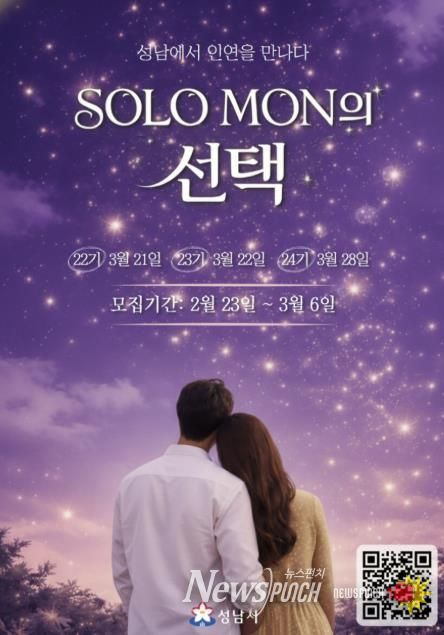 뉴스펀치 박상훈 기자 | 성남시는 오는 2월 23일부터 3월 6일까지 ‘솔로몬(SOLO MON)의 선택’ 22~24기 행사 참가 희망자 300명(남녀 각 150명)을 모집한다.