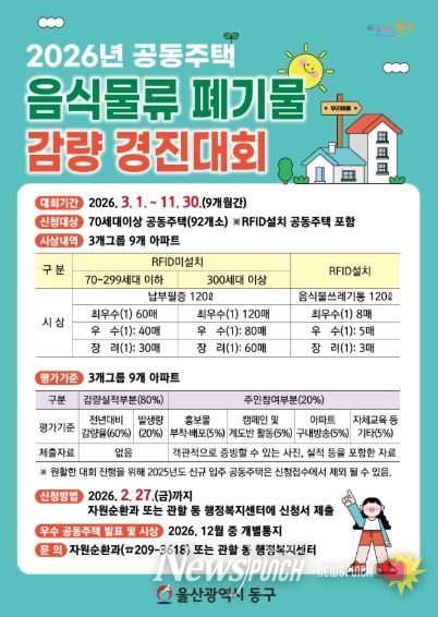 뉴스펀치 김윤걸 기자 | 울산 동구는 주민들의 음식물류 폐기물 감량에 대한 적극적 관심과 자발적 참여를 유도하기 위해 관내 70세대 이상 공동주택을 대상으로 ‘공동주택 음식물류 폐기물 감량 경진대회’를 실시한다고 밝혔다.