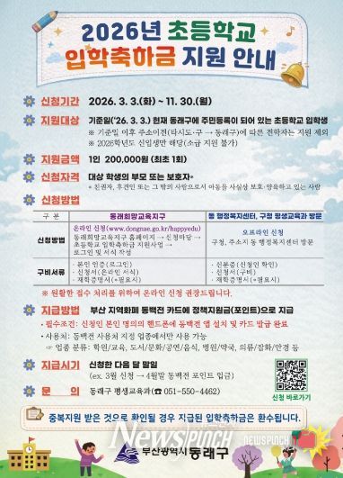 뉴스펀치 김윤걸 기자 | 부산 동래구는 보편적 교육복지 확대와 학부모의 교육비 부담 경감을 위해 올해부터 초등학교에 입학하는 신입생에게 입학축하금을 지원한다고 밝혔다.