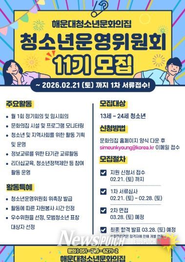 뉴스펀치 김윤걸 기자 | 해운대청소년문화의집이 지역 청소년의 참여 확대를 위해 ‘청소년운영위원회 11기 청바라기’를 공개 모집한다. 모집 대상은 해운대구에 거주하거나 관내 학교에 재학 중인 13세부터 24세 이하 청소년이며, 접수는 이달 21일까지 진행된다.