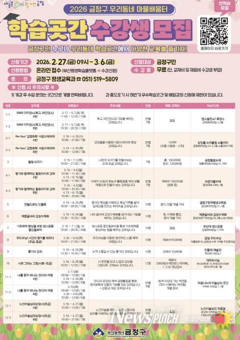뉴스펀치 김윤걸 기자 | 부산 금정구는 우리 동네 마을배움터인 ‘학습곳간’30개소를 지정하고 2월 27일부터 수강생을 모집한다.
