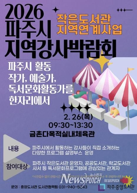 뉴스펀치 박상훈 기자 | 파주시 중앙도서관은 오는 26일 9시부터 금촌다목적실내체육관에서 녪파주시지역강사박람회’를 개최한다.