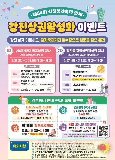 뉴스펀치 최영남 기자 | 강진군이 제54회 강진청자축제를 맞아. 지역 상권 이용을 촉진하고 소비 분위기를 확산하기 위한 ‘강진상권활성화 이벤트’를 진행한다.