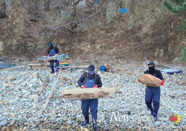 뉴스펀치 김윤걸 기자 | 울산 동구는 2월 20일 오전 대왕암공원 출렁다리 밑 해안 일대에서 해양쓰레기를 수거하는 해안 정비 활동을 했다.