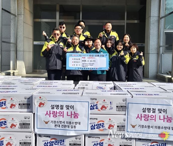 뉴스펀치 김윤걸 기자 | 기장군 정관읍행정복지센터는 최근 기장소방서 의용소방대(본대 남성대·여성대, 산불대응전문대)에서 설 명절 맞이 라면 100박스를 기탁했다고 20일 밝혔다.