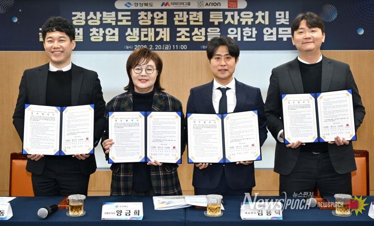 뉴스펀치 박세훈 기자 | 경상북도는 2월 20일 도청 회의실에서 ㈜더미디어그룹, ㈜아리온, ㈜심산이노베이션과 함께 지역 창업 생태계의 경쟁력 강화를 위한 업무협약(MOU)을 체결했다고 밝혔다.