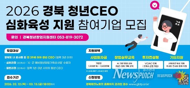 뉴스펀치 박세훈 기자 | 경상북도는 창업 초기 청년기업의 안정적인 정착과 성장을 지원하기 위해 오는 3월 13일까지 ‘2026 경북 청년CEO 심화육성 지원사업’참여 기업 40개사를 모집한다.